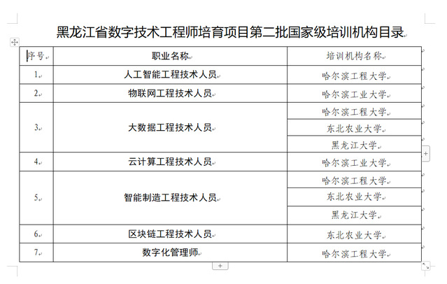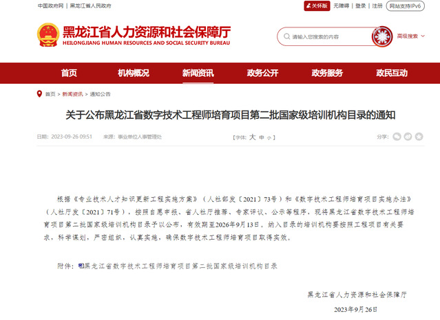 数字技术工程师培育项目是人社部贯彻落实人才强国战略,加强全国专业技术人才队伍建设的重要工作举措,是国家专业技术人才知识更新工程的重要组成部分。红足一1世足球网官方网站继续教育学院积极响应国家人才战略发展,充分发挥高校平台与资源优势,积极组织数据科学与技术学院、机电工程学院进行项目申报,经黑龙江省人力资源和社会保障厅推荐、专家评议等程序,由国家人力资源和社会保障部遴选确认了第二批培训机构拟入选名单,并面向社会进行公示。