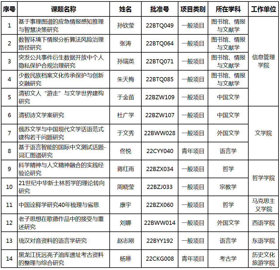 从学院分布来看,信息管理学院5项,文学院3项,哲学学院2项,马克思主义学院、西语学院、东语学院、历史文化旅游学院各1项。从学科分布来看,图书情报学与文献学4项,哲学、中国文学、外国文学、语言学各2项,考古学、宗教学各1项,哲学、文学等学科保持了传统优势,同时图书情报学与文献学取得了突破。