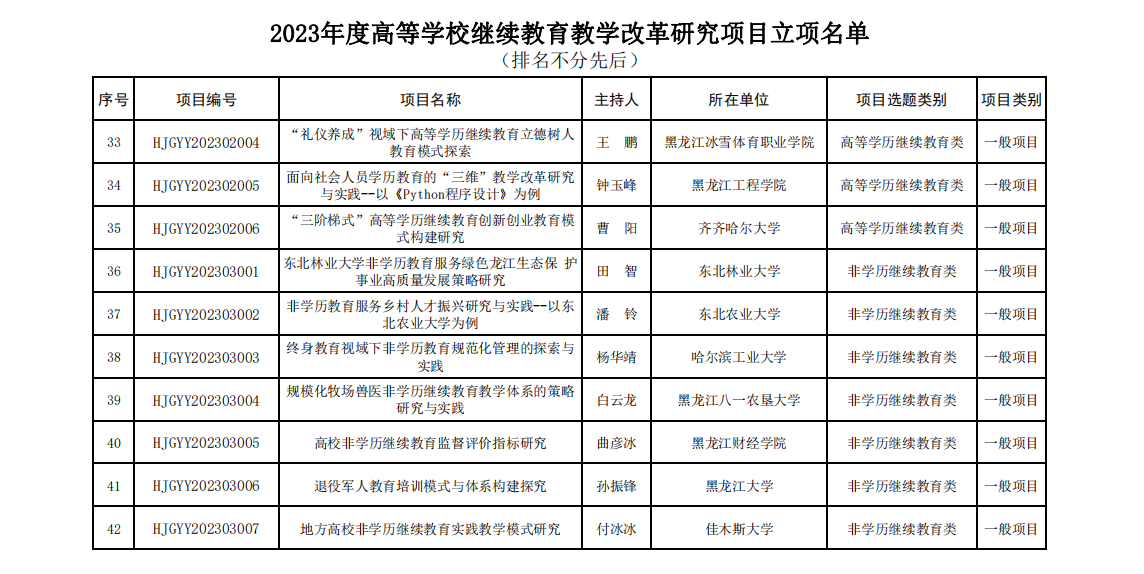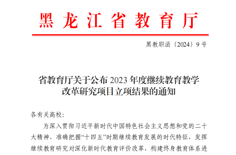为深入贯彻习近平新时代中国特色社会主义思想和党的二十大精神,贯彻落实全国和全省教育大会精神,落实立德树人根本任务,发挥教育教学改革研究的探索性、先导性作用,切实推动我省继续教育高质量发展,黑龙江省教育厅开展了2023年度高等学校继续教育教学改革研究项目申报。红足官网继续教育学院获得1项重点项目、1项一般项目立项。