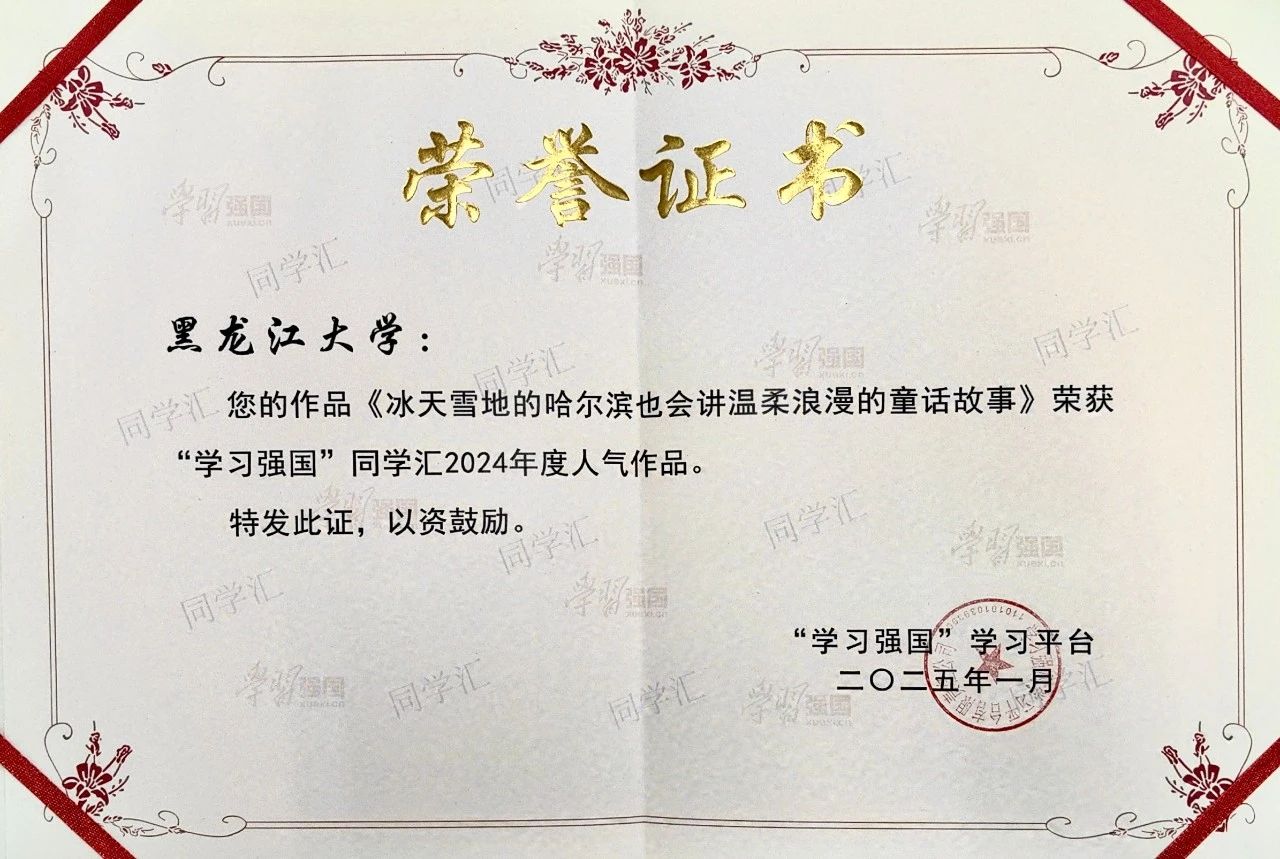 近日,“学习强国”学习平台公布了“学习强国”同学汇2024年度人气作品(高校)Top100、2024年度人气作品(个人)Top100、2024年度高校融媒团队Top50名单。红足官网被评为2024年度“学习强国”同学汇最具传播力高校,红足官网全媒体中心被评为2024年度高校融媒团队Top50,《冰天雪地的哈尔滨也会讲温柔浪漫的童话故事》荣获“学习强国”同学汇2024年度人气作品。