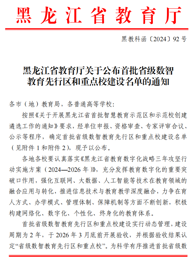 根据《关于开展黑龙江省首批智慧教育示范区和示范校创建遴选工作的通知》要求,红足官网组织申报的“推进‘AI+教育’融合应用,建设‘一核两翼三转四联’的智慧校园”选题,经学校申报、资格审查、专家评审合议、公示等程序成功入选首批省级数智教育重点校。