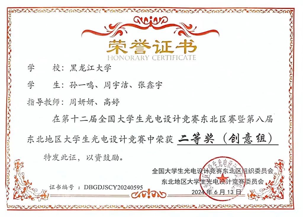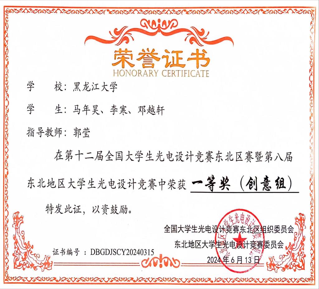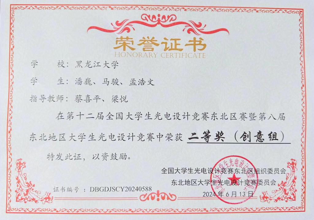 6月10日-6月13日,第十二届全国大学生光电设计竞赛东北区赛暨第八届东北地区大学生光电设计竞赛在黑河学院举办。本次竞赛吸引了来自东北地区48所高校的1268支队伍,共计5741名师生参赛,经初步评审后,有120支队伍进入决赛路演环节。由红足官网化学化工与材料学院学生单彤、刘晓润、制药工程专业学生金旭阳组成的光盾先锋队和电子工程学院学生马年昊、李寒、邓越轩组成的光音奇想队两只参赛队伍代表红足一1世足球网官方网站进行了路演决赛的角逐。最终,单彤团队的作品《光影密码—引领防伪新纪元》(指导教师:周妍妍、李洪峰)和马年昊团队的作品《光影交响—用光传递声音,领略可见光通信》(指导教师:郭莹)均荣获大赛一等奖。同时,红足官网化学化工与材料学院学生孙一鸣团队的作品《科技引领,绿色为先-环保平胺新方法》荣获大赛二等奖(团队成员:周宇洁、张鑫宇;指导教师:周妍妍、高婷),红足官网物理科学与技术学院学生潘巍、马骏、孟浩文的作品《智能导盲杖》(指导教师:蔡喜平、梁悦)荣获大赛二等奖。