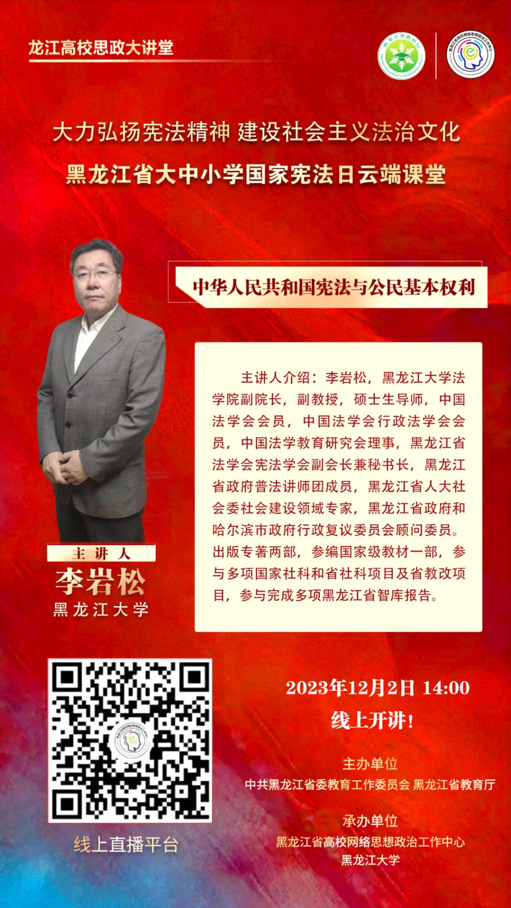 为深入学习贯彻习近平新时代中国特色社会主义思想,深入学习宣传习近平法治思想,大力弘扬宪法精神,中共黑龙江省委教育工作委员会、黑龙江省教育厅委托黑龙江省高校网络思想政治工作中心举办“大力弘扬宪法精神 建设社会主义法治文化黑龙江省大中小学国家宪法日云端课堂”学习宪法活动,以云端龙江思政大讲堂的方式,加强教育引导,全面落实普法责任,具体预告如下: