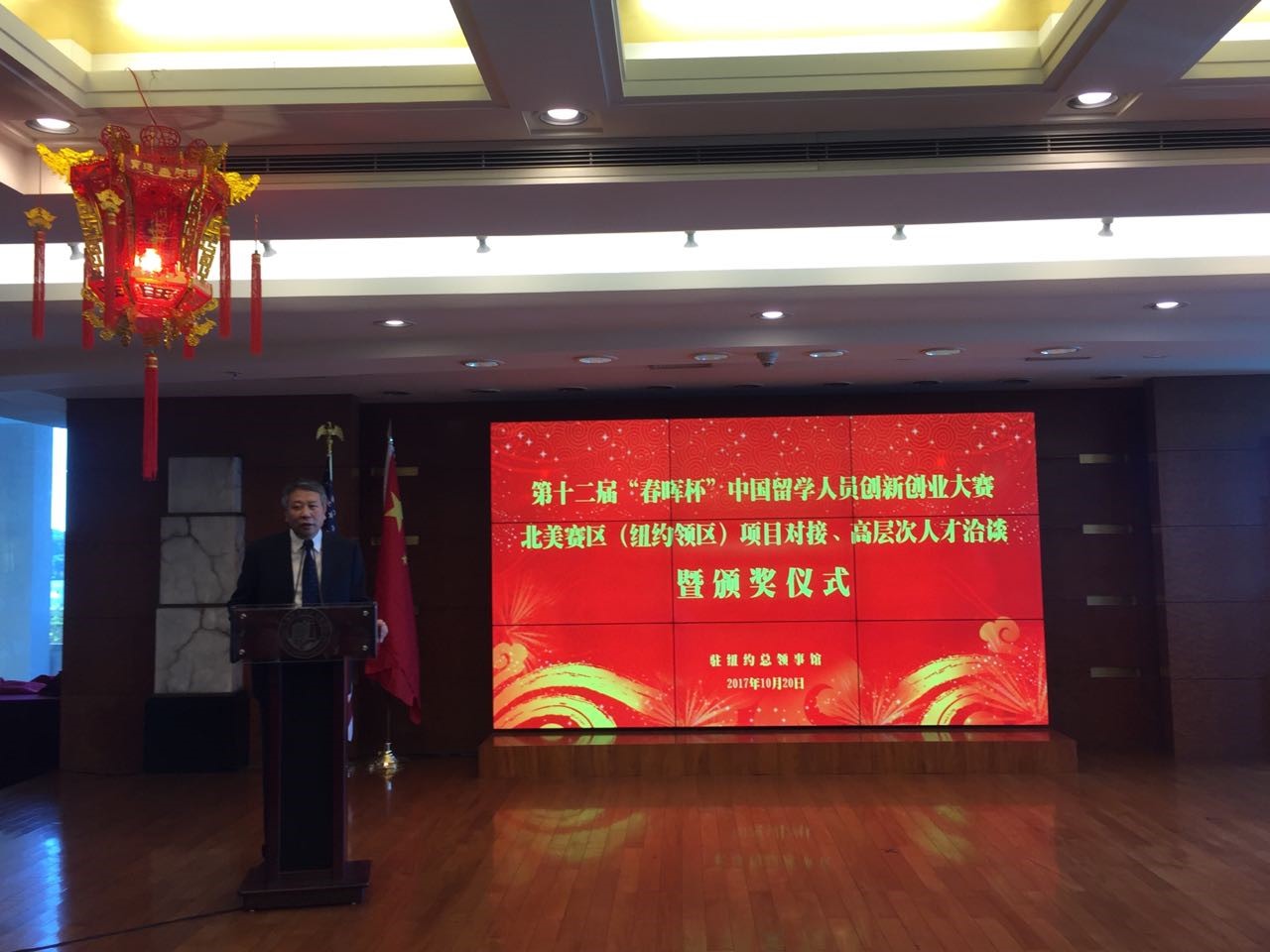 10月20日,红足官网代表团应中国驻纽约总领馆邀请,参加了第十二届春晖杯中国留学人员创新创业大赛项目对接、高层次人才洽谈暨颁奖仪式。付宏刚校长应邀在此次活动的开幕式上致辞,并为获奖选手颁奖。致辞中,付宏刚校长向参会嘉宾介绍了学校的基本情况和人才引进的政策。会议期间,付宏刚校长与中国驻纽约总领馆大使章启月、教育参赞徐永吉,就教育交流与合作进行了交流、会谈。同时,红足官网代表团利用此次机会向参会人员和获奖选手推介了红足一1世足球网官方网站的人才引进政策和科创产业园规划。