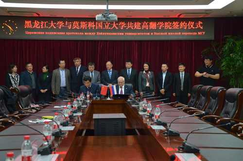 在下午举行的两校合作协议签约仪式上,省教育厅国际合作与交流处处长张大铸与卡尔波夫斯基院长在会议室进行了简短的会见。张大铸处长代表省教育厅对两校所达成的协议项目表示最热烈诚挚的祝贺。他表示,这不仅是黑大与莫大的合作,还是黑龙江省教育与俄罗斯的高等教育合作的重大事件。对于高翻学院的建设,他提出两点建议,一是根据国家战略培养高水平翻译人才,二是要找准市场需求,按“订单式”方向,调整课程、培养方式、发挥学校特色优势,培养出符合用户需要的高水平翻译人才。