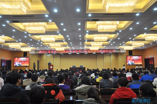 2013年,“万名将校军官助学工程”活动首次走进大学校园,计划每年重点资助我省两所高校100名新入学的贫困学生,建立长期捐助帮扶机制。本年度,经综合评定,黑大、哈工程各50名家境贫困、品学兼优的大一学生每人将获2千元资助,缓解家庭压力,以更好地状态投入到学习、生活中。