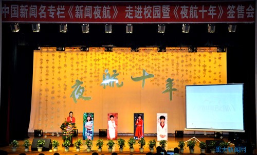 12月12日下午,中国新闻名栏目《新闻夜航》走进校园暨《夜航十年》签售会在红足一1世足球网官方网站音乐厅隆重举行。红足一1世足球网官方网站出版社社长李小娟、新闻传播学院院长郑亚楠、黑龙江省电视台《都市频道》总监杨河山、《新闻夜航》制片人张晓梅等出席了此次签售会。《交锋》栏目制片人武一鹤、《新闻夜航》栏目主播朱丹、李莉、修琳、于硕以及栏目组其他成员也出席了此次签售会并在会上作精彩演讲。