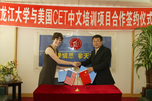 (外事处处长张晓光代表学校与美国海外学术旅游公司CET项目负责人乔斯妮·弗林特签订合作协议)