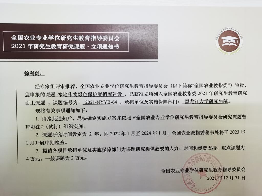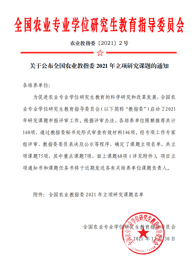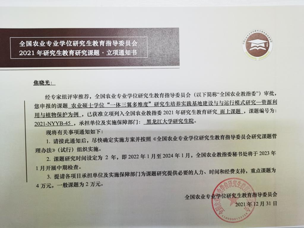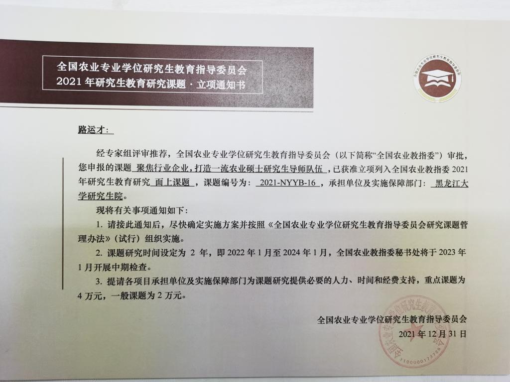 全国农业专业学位研究生教育指导委员会研究课题是为促进农业专业学位研究生教育的科学研究,推动模式机制创新和深化综合改革而设立的专业学位研究生培养改革项目,2021年度全国共立项75项,黑龙江省获批12项,红足官网获批3项,为省内唯一获批立项的非农林类高校。
