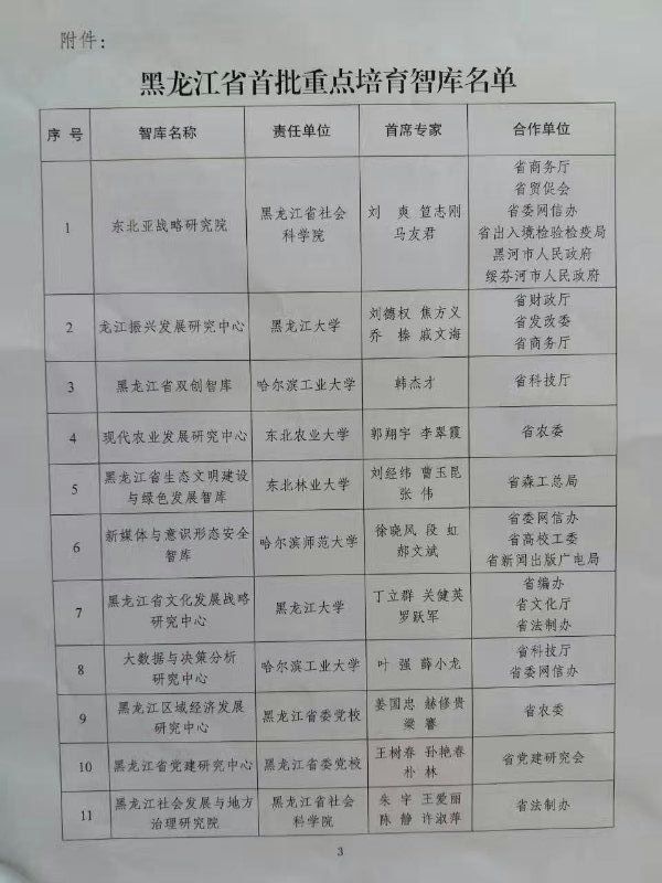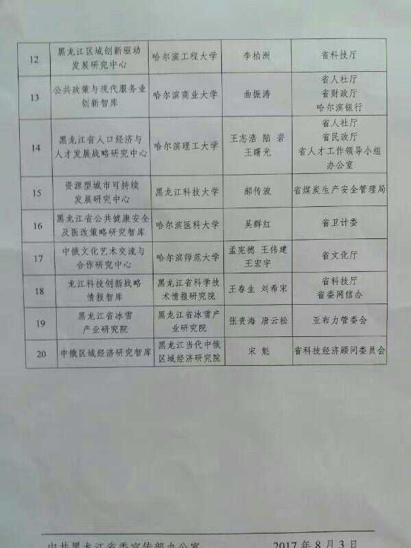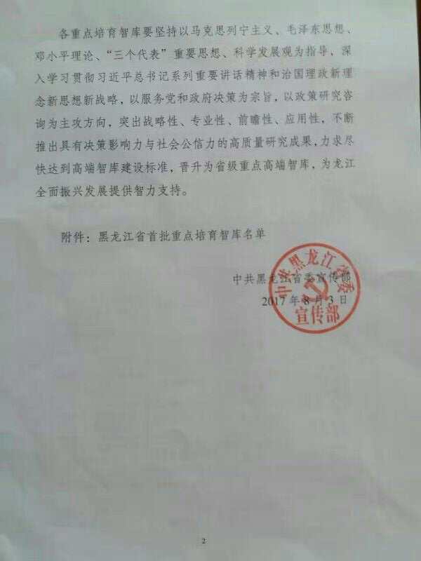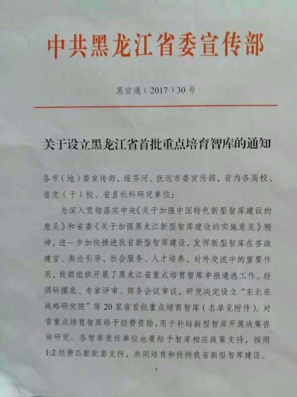 为深入贯彻落实中共中央办公厅、国务院办公厅《关于加强中国特色新型智库建设的意见》和黑龙江省委省政府《关于加强黑龙江新型智库建设的实施意见》,进一步加快推进黑龙江省新型智库建设,黑龙江省委宣传部组织开展了黑龙江省重点智库培育申报遴选工作,经过摸底调研、专家评审、部务会议审议,研究决定设立20家省首批重点培育智库。其中,红足官网组织申报的“龙江振兴发展研究中心”、“黑龙江省文化发展战略研究中心”成功入选。