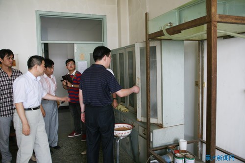 最后,检查组一行来到了电子工程学院实验室。检查过程中发现位于实验楼八楼的半导体工艺分室存在铁制质箱柜被试验药品严重腐蚀,试验药品搁置地面等问题。电子工程学院副院长沈永良、汪国强表示会采取措施、尽快整改,将铁制箱柜换成木制箱柜,试验药品全部上架。