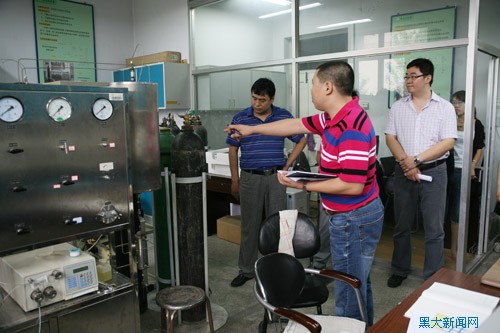 随后,检查组一行来到化学楼,在化学与化工材料学院党委书记康传红、资产管理员王岩的陪同下对催化性能研究实验室进行检查,对该实验室装有试验气体的钢瓶因年久老化而引起的气体漏泄问题,提出了将装有可燃性、助燃性气体的钢瓶配备上钢瓶支架,以确保钢瓶堆放时的安全,以及在实验室内安装报警设施,以便在气体泄漏时及时提醒室内人员安全撤离等可行性建议。对康书记所反映的化学楼没有安装地线,在使用试验器械时会出现静电漏电现象的问题,检查组表示会责令相关部门尽快安接,杜绝静电漏电现象再次发生。