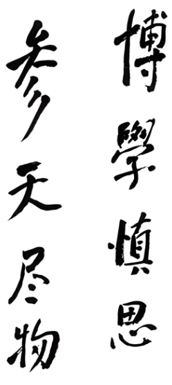 “博学慎思”出于《礼记·中庸》:“博学之,审问之,慎思之,明辨之,笃行之。”(20章) “参天尽物”出于《礼记·中庸》:“唯天下至诚,为能尽其性;能尽其性,则能尽人之性;能尽人之性,则能尽物之性;能行物之性,则可以赞天地之化育;可以赞天地之化育,则可以与天地参矣。”(22章) 张之洞在著名的《劝学篇·循序第七》中概括儒家学派的全部学问只有三句话:“空门之学,博文而约礼,温故而知新,参天而尽物。”校训两点已占2/3,至于“温故知新”不过具体学习方法,同其他两点相比就显得不那么重要了。 “博学慎思”意味广泛的学习、多方面的吸收知识,然后慎重细密地思考、理解、消化,这是一个学习的全过程。 “参天尽物”,“参”是参与的意思,朱熹注:“与天地参,谓与天地并立为三也。”“尽”,全部发挥出。原意是说每个人能全部发挥出自己诚信的本性,人类就能显现出人性的全部美好,万物也能与人和谐相处。然后能赞助天地化育万物。旨在说明人类发挥全部善良诚信的本性后便可达到天人合一,人与自然融为一体的境界。 “参天尽物”多离开本意,仅就字面涵义也可作这样的理解:考察自然奥秘,穷究万物本原,比“格物致知”包容性更大,内涵更丰富,大体相当于司马迁的“究天人之际,通古今之变”。当然,作为研究探索具体知识,专门学问来理解也是完全可以的,作形而上、 形而下的理解都通,也有很强的人文精神力度。